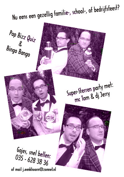 Welkom, op de PopBizQuiz website. Sinds 1995 organiseren mc Tom & dj Jerry deze gezellige popkennis quiz in poppodium de Tagrijn Hilversum. Maar sinds 2003 treden de jongens ook in het land op!